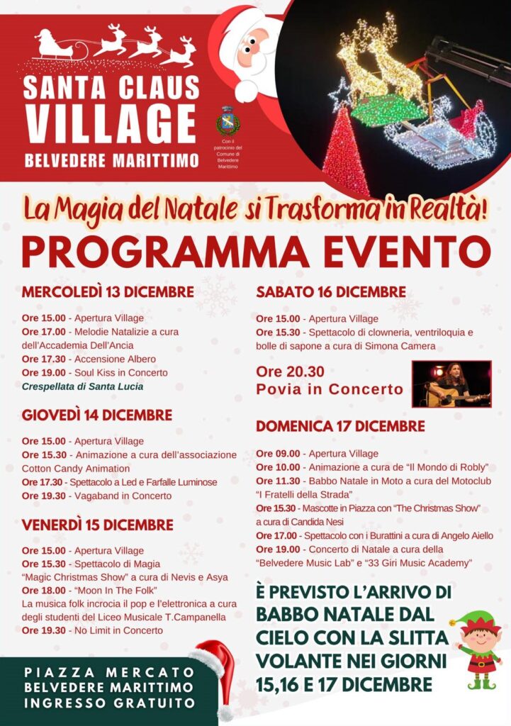 Dal 13 al 17 Dicembre torna il Santa Claus Village a in piazza Mercato a Belvedere Marittimo, cinque giorni dedicati alle bambine e ai bambini del territorio ma anche agli adulti che con l’occasione tornano un po’ piccoli. Si parte mercoledì 13 Dicembre con la tradizionale crespellata di Santa Lucia, sabato serata clou con il concerto di Povia e infine domenica un’intera giornata dedicata al Natale.