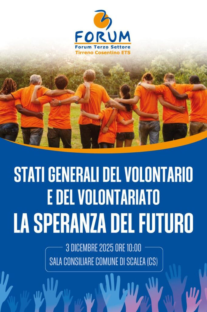 Il Forum Terzo Settore Tirreno Cosentino – ETS annuncia che mercoledì 3 dicembre 2025, alle ore 10.00, presso la Sala Consiliare del Comune di Scalea, si terrà l’iniziativa “Stati Generali del Volontario e del Volontariato. La speranza del futuro”.