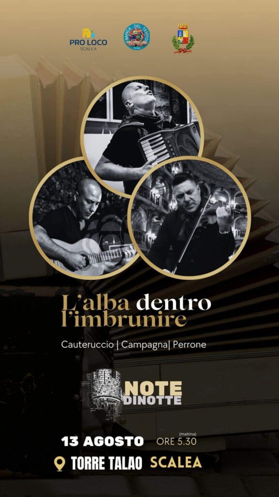 Un concerto, rientrante in una masterclass promossa dall’amministrazione comunale di concerto con la Pro Loco di Scalea e la banca del tempo, che si svolgerà all’alba, alle ore 5:30. Il suggestivo spettacolo di musica si terrà a Torre Talao, icona della cittadina della Riviera dei Cedri, il 13 Agosto. A rendere ulteriormente magica l’atmosfera, in uno dei posti naturali più belli del litorale, saranno le esibizioni di Pietro Perrone (Violino), Enzo Campagna (Chitarra), Salvatore Cauteruccio (Fisarmonica).