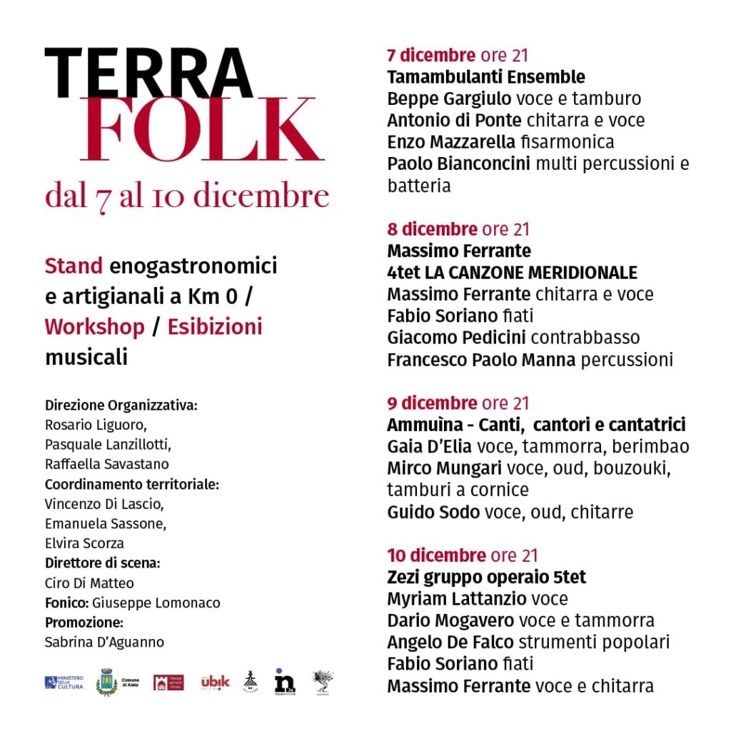 Saranno infatti quattro le formazioni che proporranno al pubblico le proprie “visioni” di musica popolare. Il 7 dicembre apriranno “le danze” i Tamambulanti Ensemble; l’8 sarà la volta di Massimo Ferrante 4tet; il 9 dicembre spazio agli Ammuìna; il 10, a concludere la kermesse, sarà la volta di Zezi gruppo operaio 5tet.