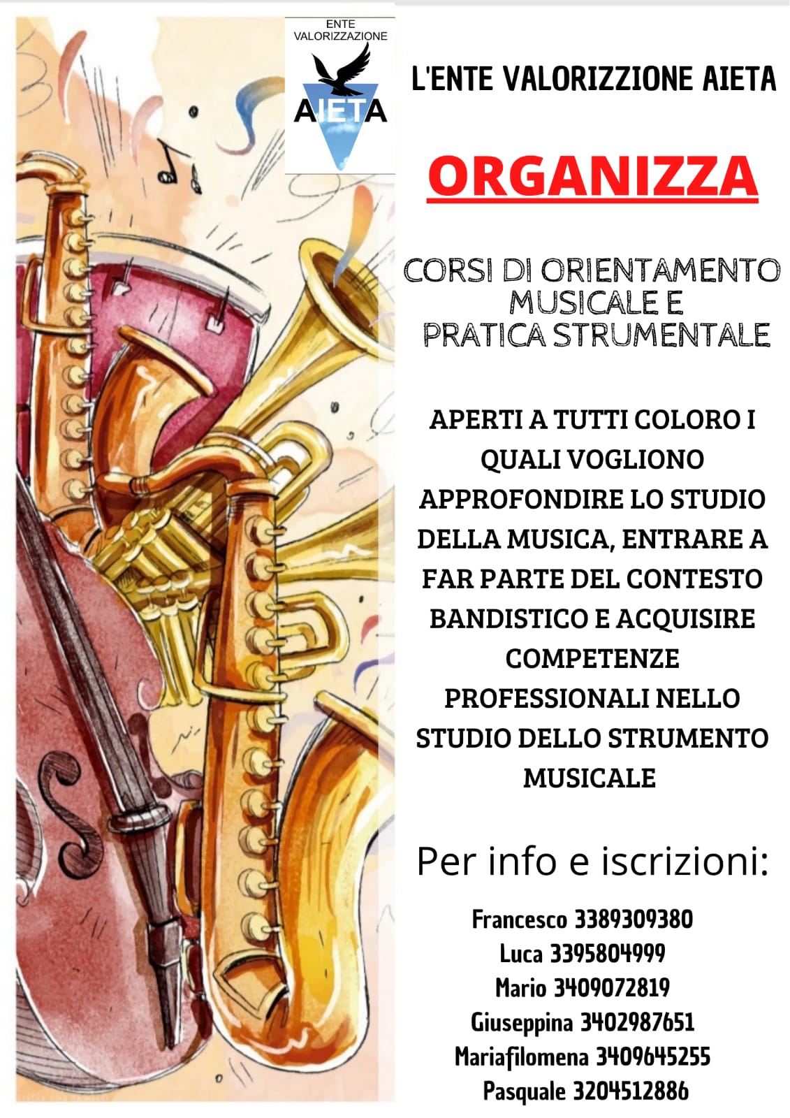 Corsi di orientamento musicale e pratica strumentale. Questa l’iniziativa dell’Ente valorizzazione Aieta che è pronto a reclutare persone che vogliono approfondire lo studio della musica e acquisire competenze professionali nello studio di uno strumento. L’obiettivo è anche quello di far entrare i provetti musicisti all’interno del contesto bandistico.