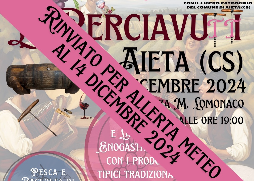 Rinviata a sabato 14 dicembre la serata enogastronomica dal titolo “Li Perciavutti”, che avrebbe dovuto svolgersi questa sera, sabato 07 dicembre, ad Aieta. Gli organizzatori hanno preferito non rischiare, viste le avverse condizioni meteo.