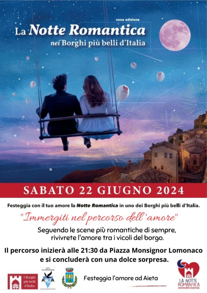 Torna sabato 22 Giugno, a partire dalle ore 21.30, la Notte romantica 2024 di Aieta. L’iniziativa rientra nelle manifestazioni annuali di valorizzazione dei Borghi più belli d’Italia, di cui il comune tirrenico fa parte. Come le scorse edizioni, il percorso, al termine del quale ci sarà una dolce sorpresa per tutti gli innamorati, inizierà da piazza Monsignor Lomonaco. L’evento è organizzato dall’Ente valorizzazione Aieta, in collaborazione con l’amministrazione comunale.