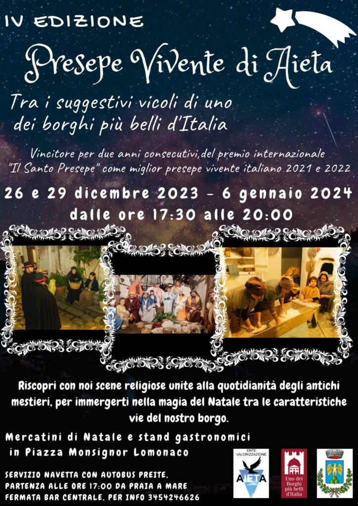 Tutto è pronto per la quarta edizione del “Presepe vivente di Aieta” riconosciuto, per due anni consecutivi, dal concorso internazionale “Il Santo presepe” indetto dall’associazione “La Stella Di Betlem” con l’iniziativa “Cavalieri del Santo Presepe”- quale miglior presepe vivente italiano del Natale 2021 e 2022, nonché riconosciuto tra le Eccellenze Calabresi 2023 dall’associazione Fatto in Calabria.