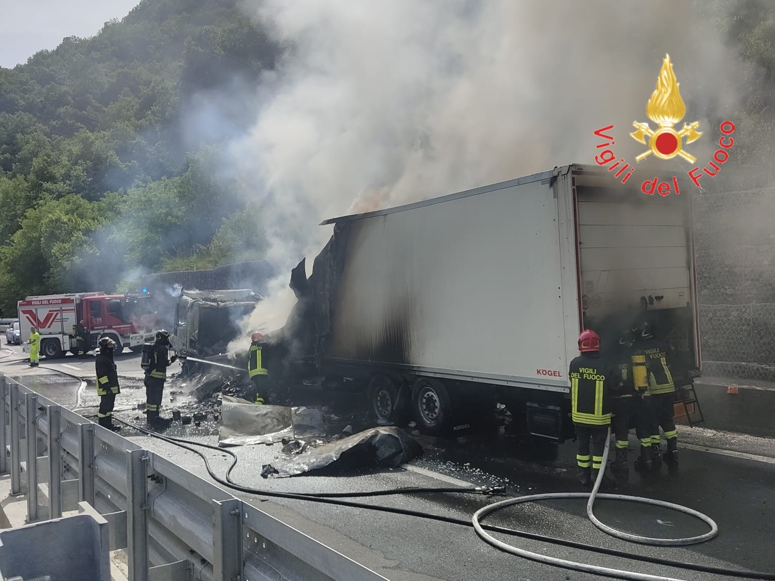 Altilia Grimaldi. Camion in fiamme sull’A2. Intervento dei Vigili del Fuoco