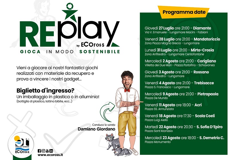 Le tappe di “RePlay” prenderanno il via il prossimo giovedì 27 luglio da Diamante a partire dalle ore 21.00 in via V. Emanuele – Lungomare Mancini-Fabiani.