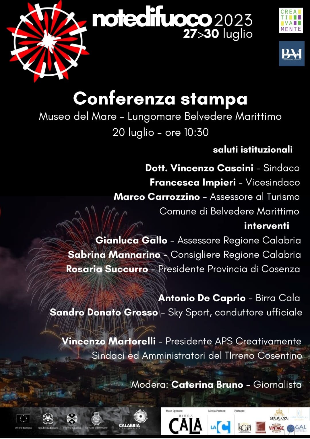 Il Festival Note di Fuoco, il più suggestivo evento di arte pirotecnica in Calabria, si appresta a sorprendere il pubblico con un programma più ricco che mai. La conferenza stampa di presentazione avrà luogo giovedì 20 luglio alle ore 10:30 presso i locali del Museo del Mare di Belvedere Marittimo.