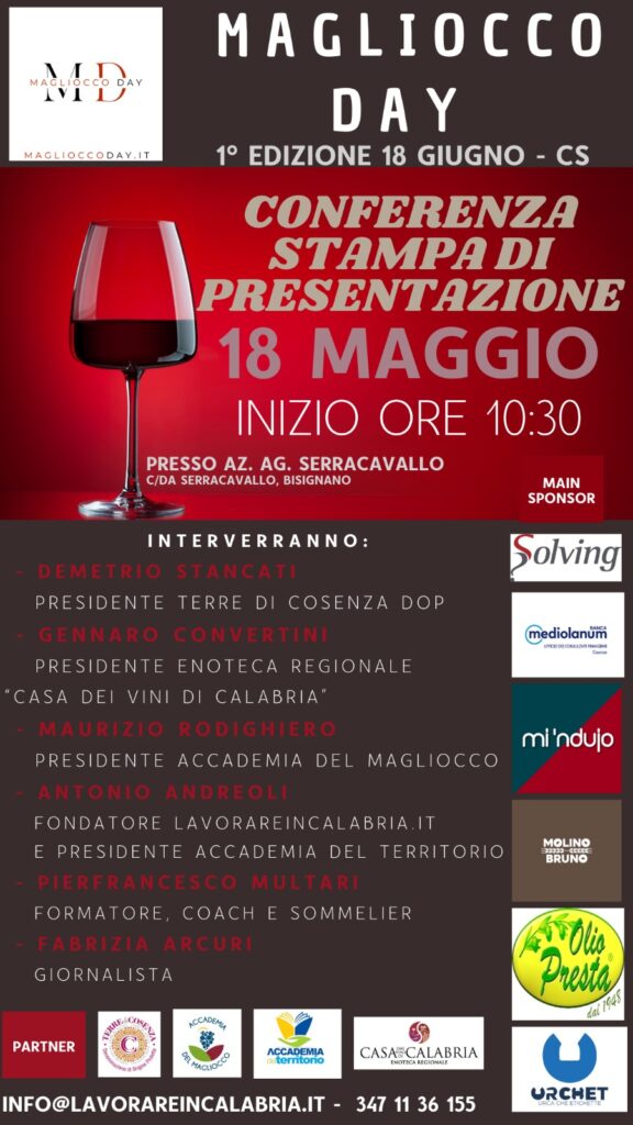La Calabria si appresta ad ospitare la prima edizione di un evento di rilievo nel panorama enogastronomico e turistico regionale: il Magliocco Day, in programma per il 18 giugno. La conferenza stampa di presentazione, fissata per il 18 maggio alle ore 10:30 presso l’Azienda Serracavallo a Bisignano, sarà l’occasione per mettere in luce le eccellenze della Calabria e promuovere lo sviluppo economico attraverso la valorizzazione del patrimonio vitivinicolo, culinario e turistico del territorio.