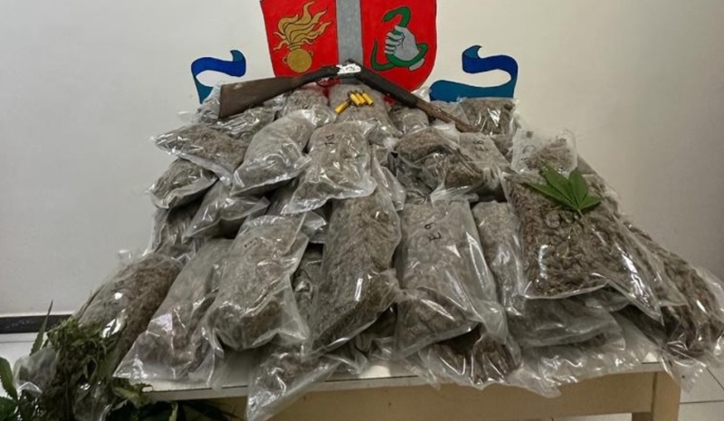 A quel punto è stato immediatamente bloccato. Con il supporto di altre pattuglie giunte sul posto è stata effettuata un’attività di perquisizione estesa a tutti i locali e magazzini in uso al soggetto appena bloccato. Sono stati rinvenuti, in un magazzino, circa 280 grammi di marijuana, un bilancino di precisione e materiale vario per il confezionamento dello stupefacente. Inoltre, in una grotta calcarea, a pochi metri di distanza dal citato magazzino, sempre all’interno della proprietà del 61enne, sono stati recuperati un fucile marca Beretta cal. 20, 4 cartucce del medesimo calibro e 45 confezioni sottovuoto contenenti in totale ben 12 kg di marijuana.