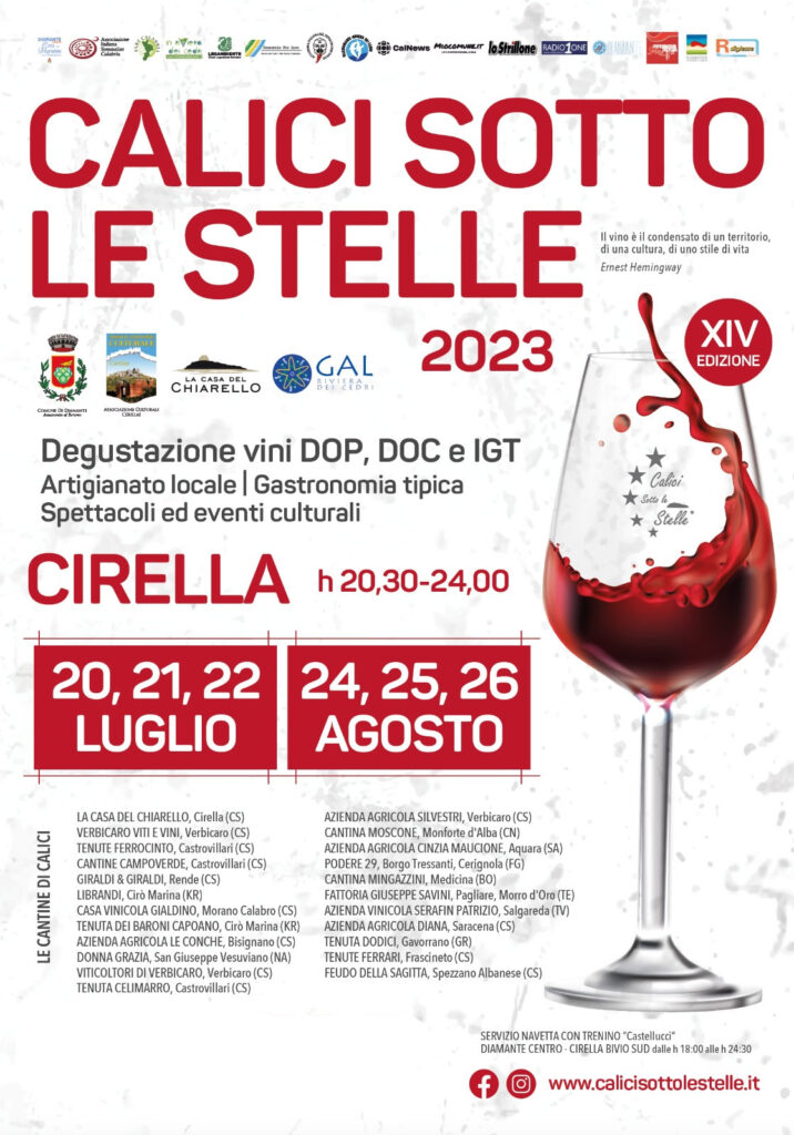Prende il via a Cirella giovedì 20 luglio, per concludersi sabato 22 luglio, la prima parte della quattordicesima edizione di Calici Sotto le Stelle, l’evento che annualmente promuove le eccellenze enologiche del territorio, organizzato dall’Associazione Culturale Cerillae e dalla Casa del Chiarello, con il patrocinio dell’Amministrazione Comunale di Diamante e che vede tra i suoi partner il GAL Riviera dei Cedri. Ad agosto dal 24 al 26, la seconda parte della manifestazione che quest’anno torna nel tradizionale format del doppio appuntamento annuale.