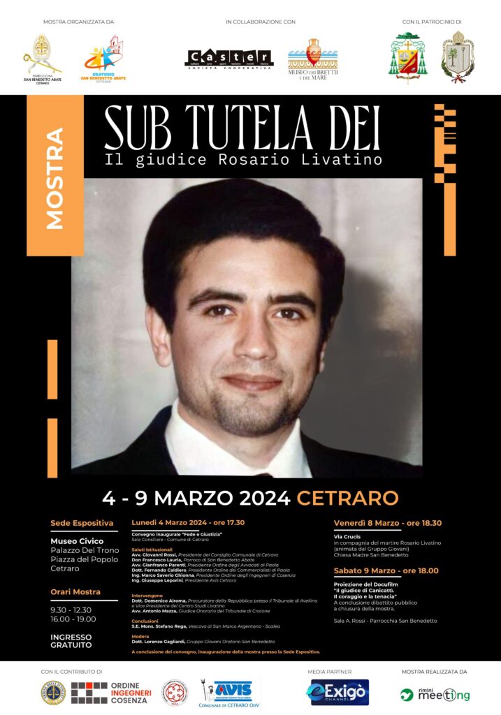 Arriverà a Cetraro dal 4 al 9 marzo la mostra “Sub tutela Dei” (espressione ricorrente nelle pagine della sua agenda) dedicata alla vita del giudice Rosario Livatino, il magistrato siciliano che ha operato nell’agrigentino assassinato nel 1990 in un agguato mafioso a soli 38 anni.