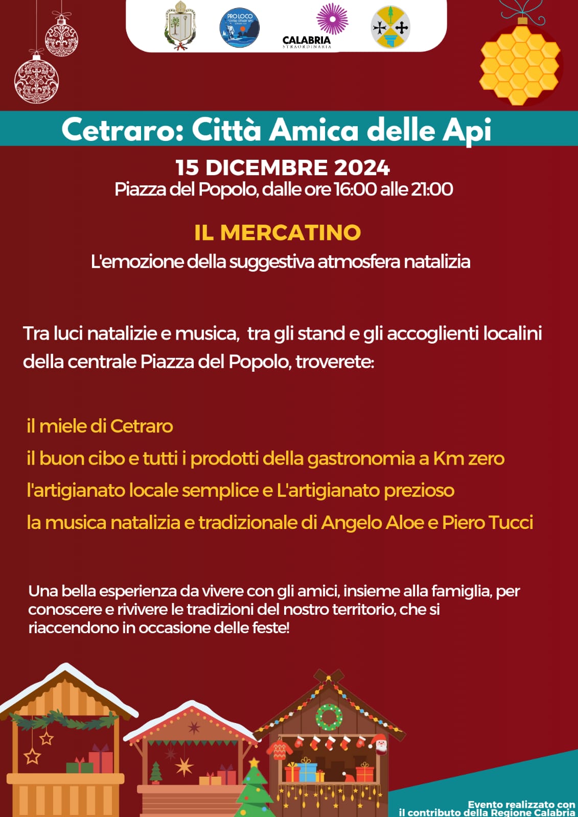 L’evento, con inizio alle h. 16:00, si articola in un programma che prevede: un mercatino di prodotti a base di miele, e in genere, della tradizione gastronomica e di prezioso artigianato locale, a Piazza del Popolo; musica natalizia e tradizionale, curata e a tratti remixata dai professionisti Angelo Aloe e Piero Tucci, che sapranno inserire anche brani pop, per un sano divertimento offerto alla città.