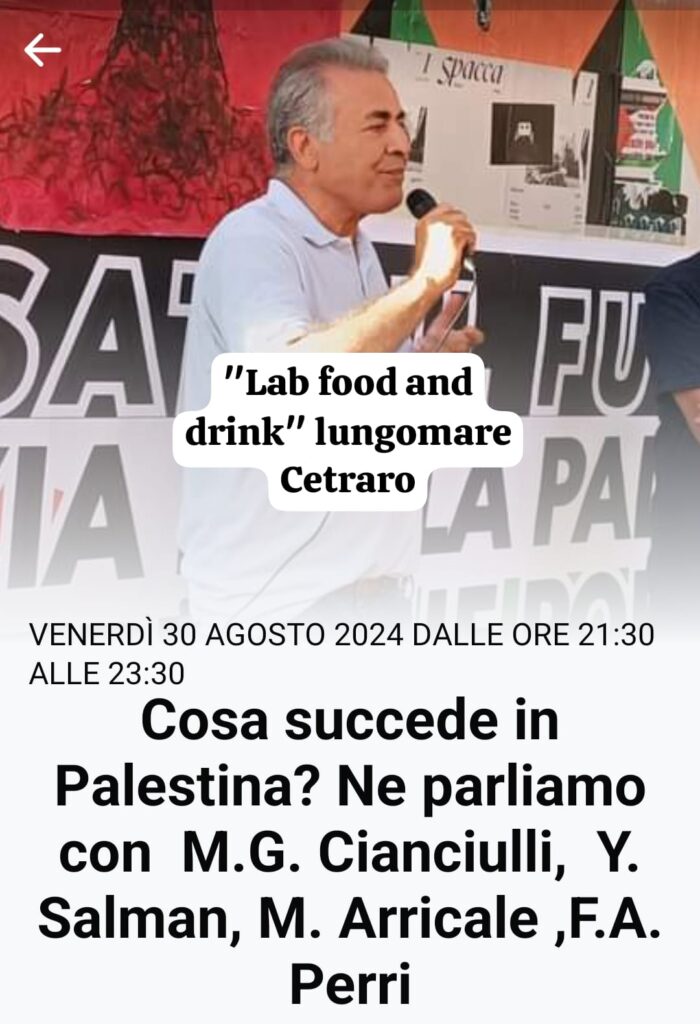 Venerdì 30 agosto, sul lungomare di Cetraro Marina (provincia di Cosenza), presso il giardino di LB Food & Drink, alle ore 21:30, si terrà un evento di informazione e divulgazione dedicato alla Palestina, alla sua cultura e alla drammatica situazione che si sta vivendo in quella martoriata terra.
