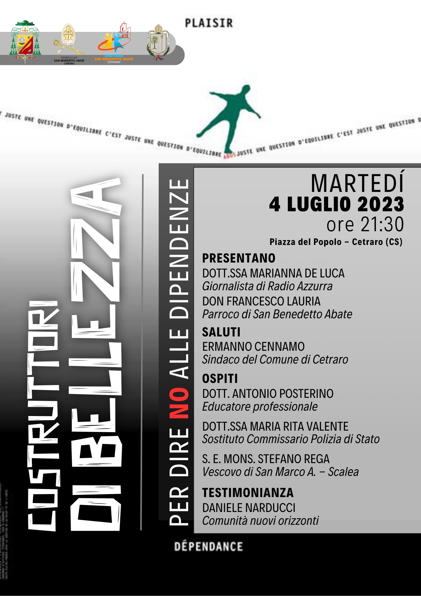 Interverranno Mons. Stefano Rega – Vescovo della Diocesi di San Marco Argentano-Scalea; il dott. Antonio Posterino, esperto di dipendenza da sostanze alteranti già educatore professionale presso la Comunità di Emmaus e attualmente presso il sert di Scalea; il Sostituto Commissario Maria Rita Valente Comandante del Distaccamento Polizia Stradale di Scalea, professionista che si spende molto in attività di prevenzione e contrasto a fenomeni legati – ad esempio – all’utilizzo di sostanze alteranti da parte di chi pericolosamente si mette alla guida e la testimonianza di un giovane Daniele Narducci della Comunità di Nuovi Orizzonti che dalla dipendenza ha scelto la via della libertà.