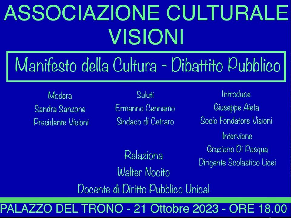 Domani, sabato 21 ottobre, alle ore 18, presso il Palazzo del Trono di Cetraro, si terrà la presentazione dell’associazione culturale “Visioni”. Sarà un vero e proprio dibattito pubblico che coinvolgerà le forze politiche, le associazioni e soprattutto i cittadini. L’obiettivo: un vero e proprio manifesto della cultura.