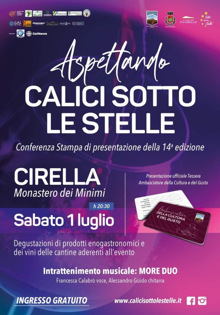 Si terrà nella stupenda cornice del Monastero dei Minimi di Cirella, sabato 1 luglio 2023, a partire dalle ore 20:30 la serata di presentazione di Calici sotto le stelle®, l’evento promozione delle specificità enologiche del nostro territorio giunto alla sua 14° edizione. L’evento, prevede un incontro-dibattito in cui verranno illustrate le novità della prossima edizione di Calici sotto le stelle® ed in cui interverranno relatori ed esperti in ambito enogastronomico e rappresentanti istituzionali. Sarà ufficialmente presentata, inoltre, la tessera di Ambasciatore della Cultura e del Gusto, nuova iniziativa di promozione curata dall’Associazione Cerillae.