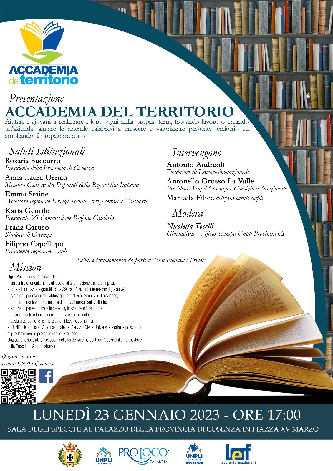 La Unpli con oltre 6.200 associazioni Pro Loco iscritte costituisce il punto di riferimento a livello nazionale di queste associazioni (la prima è nata nel 1881) che vantano un totale di oltre 600.000 soci, nel caso specifico l’UNPLI Provinciale di Cosenza, e la società Tian S.r.l. proprietaria del Marchio Lavoroeformazione.it (online dal 2006) presente in 13 Paesi uniscono le forze per realizzare le Accademie del Territorio/Locali al fine di: