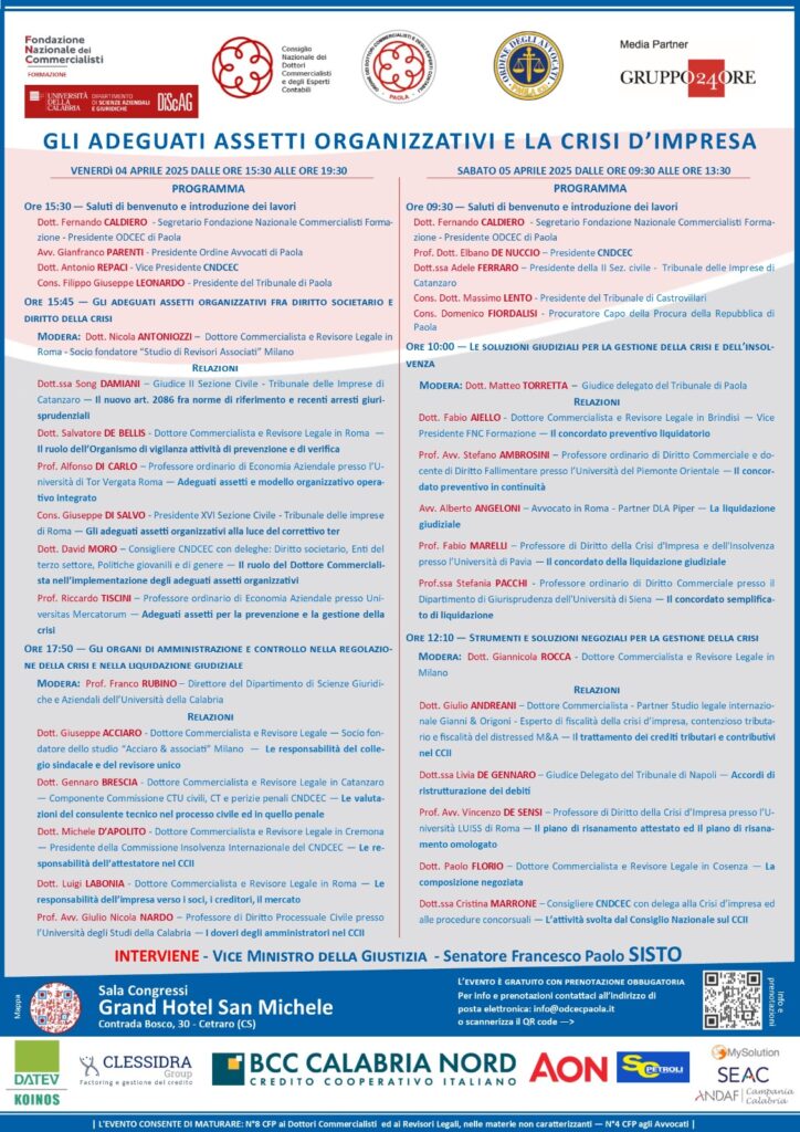 Il 4 e 5 aprile 2025, presso il prestigioso Grand Hotel San Michele di Cetraro (CS), si terrà un evento di grande rilevanza per il mondo professionale e giuridico: “Gli Adeguati Assetti Organizzativi e la Crisi d’Impresa”. L’incontro, che vede la partecipazione di autorevoli esperti del settore, è organizzato con il patrocinio della Fondazione Nazionale dei Commercialisti, del Consiglio Nazionale dei Dottori Commercialisti e degli Esperti Contabili e dell’Università della Calabria, con il supporto del Gruppo 24 Ore come media partner.
