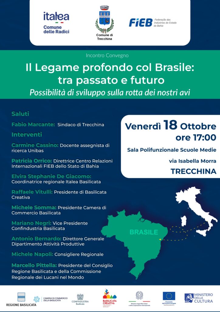 Ma vuole farlo non in un’ottica nostalgica, bensì provando a ragionare sulle possibilità di sviluppo di relazioni istituzionali e commerciali tra il territorio lucano e quelle realtà. Ciò sarà possibile grazie alla presenza di Patrícia Orrico, discendente di trecchinesi, direttrice dell’ufficio relazioni internazionali della FIEB (Federação das Indústrias do Estado da Bahia), che illustrerà alle istituzioni presenti e alle categorie produttive le possibili vie da percorrere per avvicinare due realtà geograficamente lontane, ma tra cui sono intercorsi legami profondi nell’epoca delle grandi migrazioni.