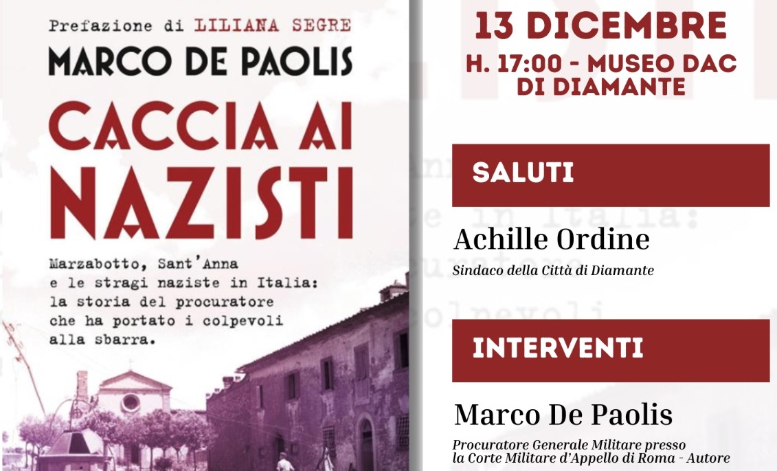 Sarà presentato venerdì 13 dicembre, alle ore 17, al Museo DAC di Diamante, il libro “Caccia ai nazisti. Marzabotto, Sant’Anna e le stragi naziste in Italia: la storia del procuratore che ha portato i colpevoli alla sbarra” (Rizzoli), scritto da Marco De Paolis, Procuratore Generale Militare presso la Corte Militare d’Appello di Roma. Pagine intense – con la prefazione di Liliana Segre – in cui il Procuratore De Paolis racconta le indagini, gli interrogatori, gli esami dei testimoni che in quindici anni, tra il 2002 e il 2018, hanno portato a oltre 500 procedimenti giudiziari contro i criminali di guerra nazisti e fascisti per gli eccidi di civili e militari.