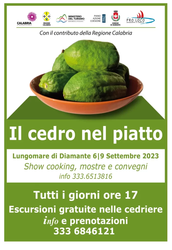 Realizzata col contributo della regione Calabria prevede l’organizzazione di show cooking con gli chef Enzo Grisolia, Enzo Barbieri e Palmino Raffo tutti col cedro protagonista. Una mostra fotografica curata da Enzo Monaco illustrerà le tradizioni agricole e gastronomiche del cedro con particolare attenzione ai riti religiosi della sukkot ebraica. Sabato 9 settembre la presentazione del libro di Enzo Monaco “Il cedro di Calabria”. Rubbettino editore con copie omaggio ai partecipanti. Tutti i giorni dal 6 al 9 settembre alle ore 17 escursioni gratuite nelle cedriere (info e prenotazioni 333/6846121).