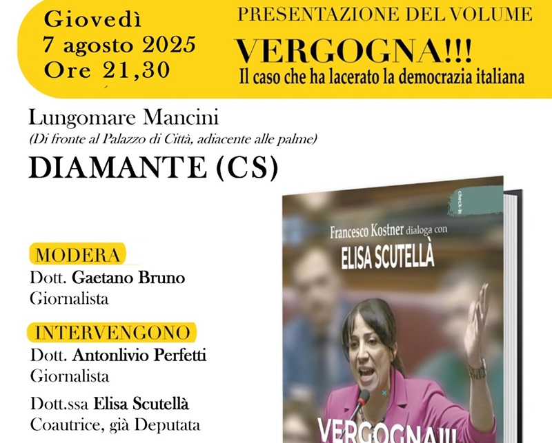 Cresce l’attesa per la presentazione del libro dell’ex deputata Elisa Scutellà: “ Vergogna!!! Il caso che ha lacerato la democrazia italiana”. Nel libro, che verrà presentato a Diamante il prossimo 7 agosto sul Lungomare Mancini, viene ripercorsa la vicenda che ha portato all’estromissione in Parlamento di Scutellà a favore del deputato di Forza Italia Andrea Gentile.