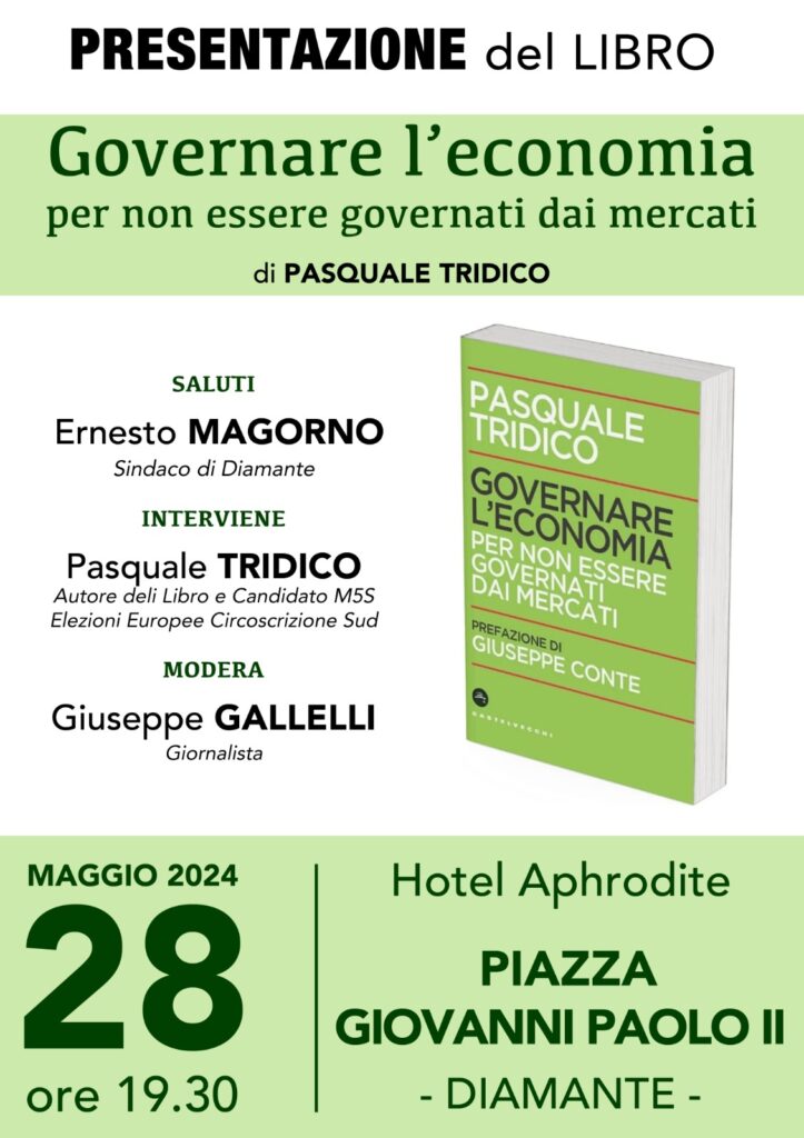 Sarà presentato il prossimo 28 maggio a Diamante il libro “Governare l’economia per non essere governati dai mercati”, scritto da Pasquale Tridico, capolista del M5S nel collegio Sud per le prossime elezioni europee e già presidente dell’Inps.
