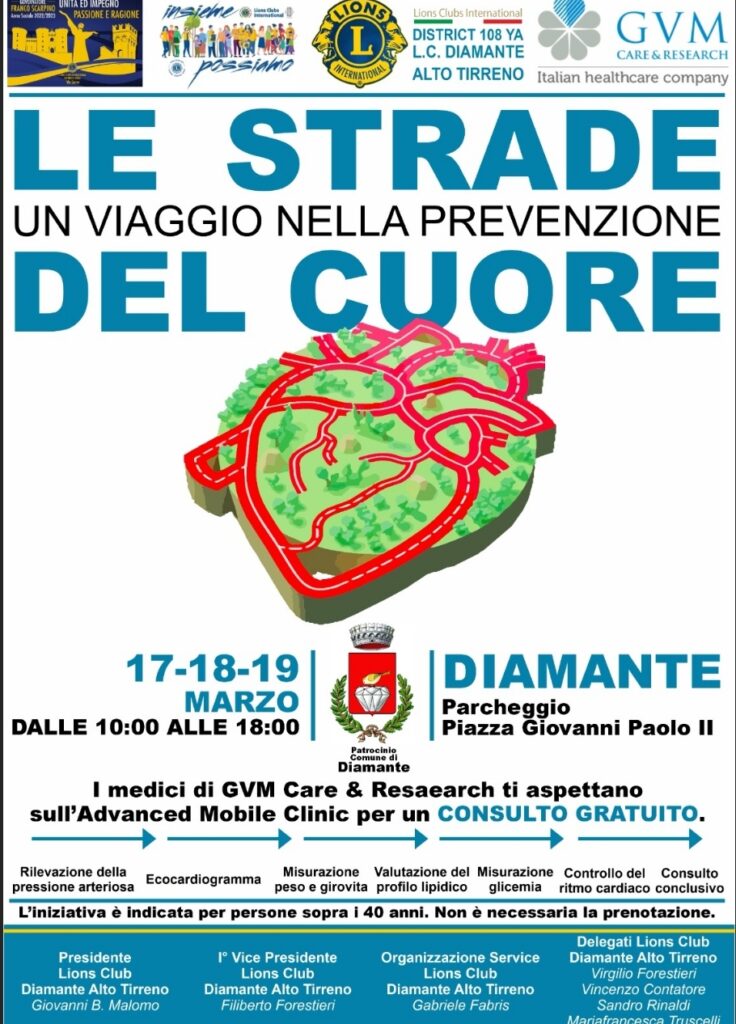 Si svolgerà venerdì, sabato e domenica prossimi, 17, 18 e 19 Marzo, lo screening cardiologico gratuito e senza prenotazione, organizzato dal Lions Club Diamante Alto Tirreno. Durante i giorni dedicati allo screening, sarà posizionata in Piazza Giovanni Paolo II a Diamante, l’Advanced Mobile Clinic, una imponente struttura mobile dotata di avanzata attrezzatura medica. Gli screening proseguiranno dalle ore 10.00 fino alle 18.00 e sarà possibile sottoporsi ad esami come la rilevazione della pressione arteriosa, elettrocardiogramma e rilevazione del ritmo cardiaco insieme ad altri esami utili ad individuare lo stato di salute del cuore. Il vicesindaco del comune di Diamante, Giuseppe Pascale, esprime il suo plauso per l’iniziativa.