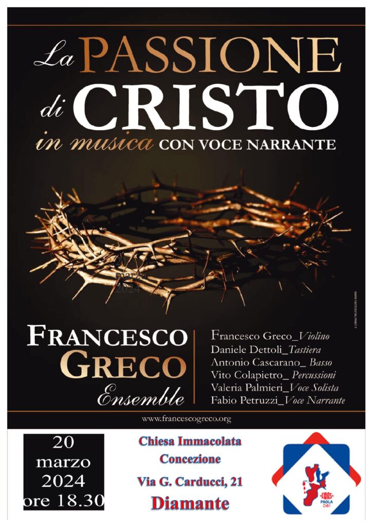 L’occasione per riflettere insieme sull’importanza del donare e donarsi agli altri è data dal progetto ideato da Francesco Greco Ensemble, “La Passione di Cristo in musica con voce narrante” che vedrà due date calabresi: la prima il 20 marzo a Diamante per l’appunto, la seconda giovedì 21 marzo a Paola all’interno del Santuario di San Francesco di Paola. Il concerto sarà un’esperienza che unirà musica, arte e spiritualità “…per riscoprire insieme i suoni dell’anima”. Il progetto nasce dall’idea del Maestro Francesco Greco, violinista tarantino apprezzato e pluripremiato a livello nazionale, di coniugare Sacre Scritture, arte pittorica e musica, creando un’esperienza emotiva e spirituale unica nel suo genere.