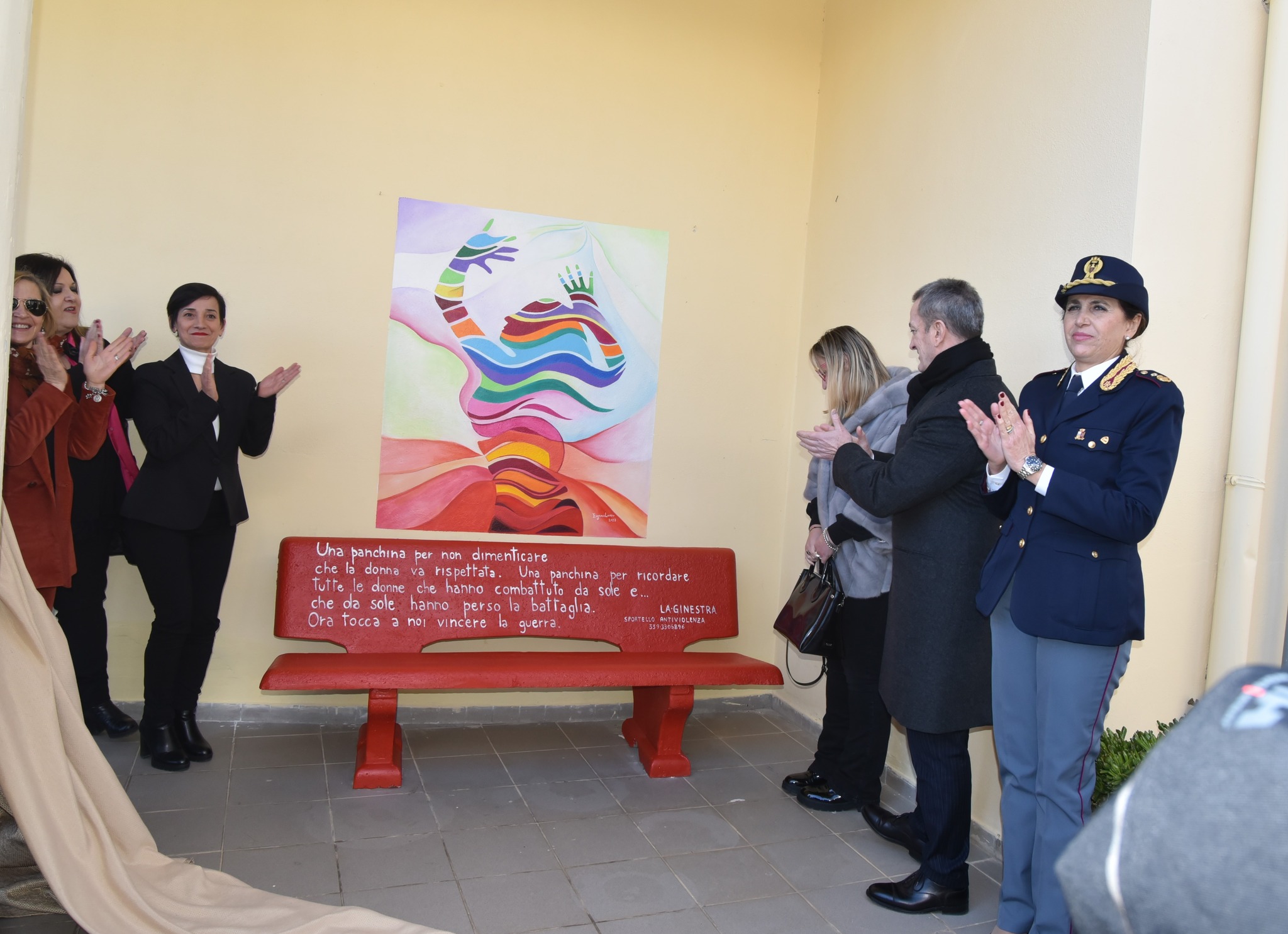 A chiusura della manifestazione è stata inaugurata la Panchina rossa posta accanto al murale realizzato dall’artista Eugenia loiero. La stessa panchina e il murale che raffigura una donna che eleva le mani al cielo come segno di forza ma anche per dire Basta alla violenza, è stata installata nella prima tappa di sensibilizzazione l’anno scorso al Liceo “Pietro Metastasio” di Scalea . La manifestazione si è conclusa con le note della canzone “Hallelujah”intonata da due ragazze dell’Istituto.