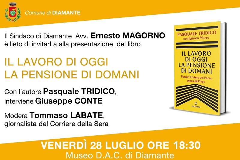 Importante appuntamento venerdì 28 luglio a Diamante con la presentazione del libro di Pasquale Tridico “Il lavoro di oggi, la pensione di domani” (edizioni Solferino), con la presenza del leader del movimento 5 Stelle e già presidente del Consiglio, Giuseppe Conte.