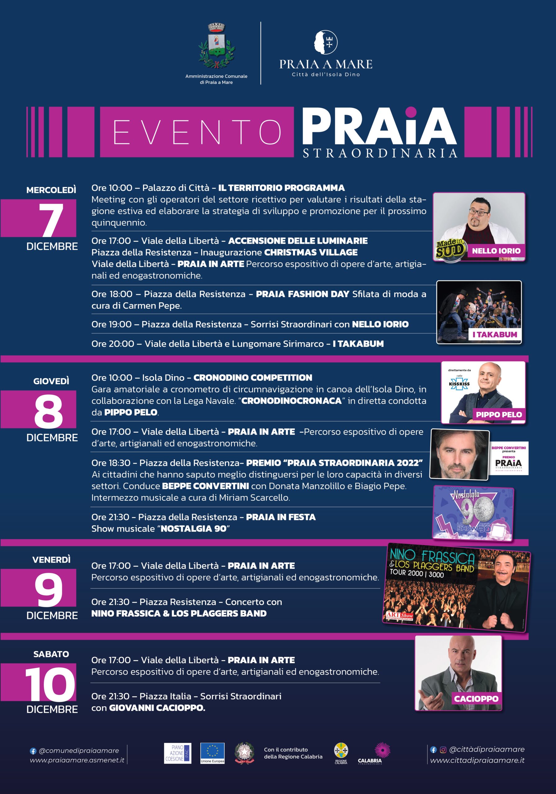 Altro appuntamento importante, come sottolineato dal sindaco De Lorenzo, il premio “Praia Straordinaria 2022”, che si terrà alle 18.30, giovedì 08 dicembre, presso piazza della Resistenza, e durante cui saranno premiati coloro che si sono distinti per il bene e la crescita della comunità praiese. La serata sarà condotta da Beppe Convertini insieme a Donata Manzolillo e Biagio Pepe.