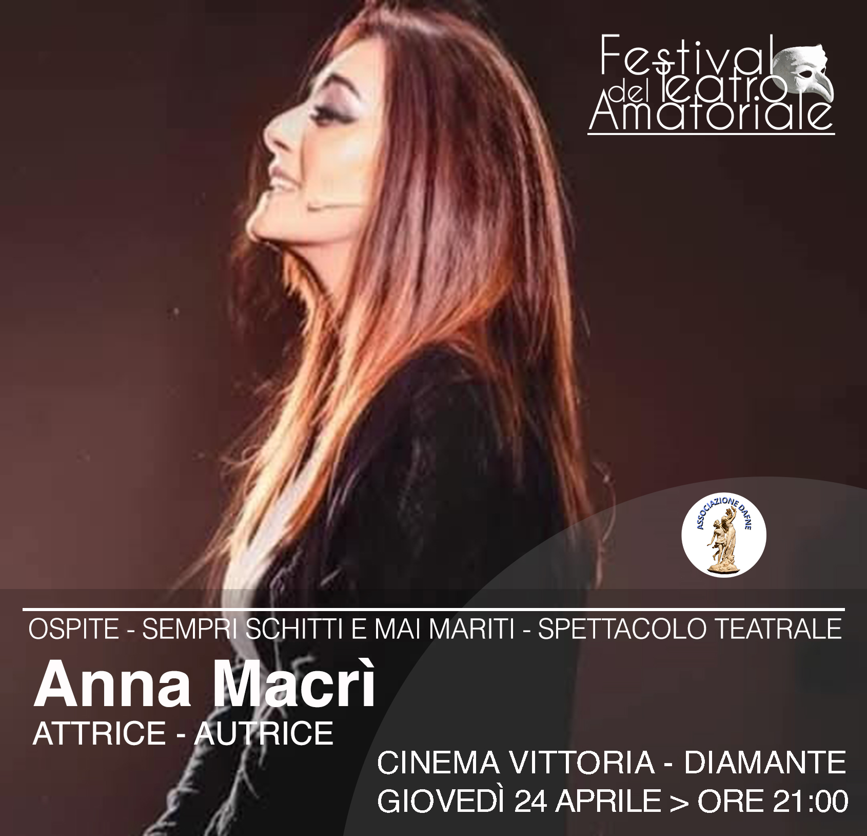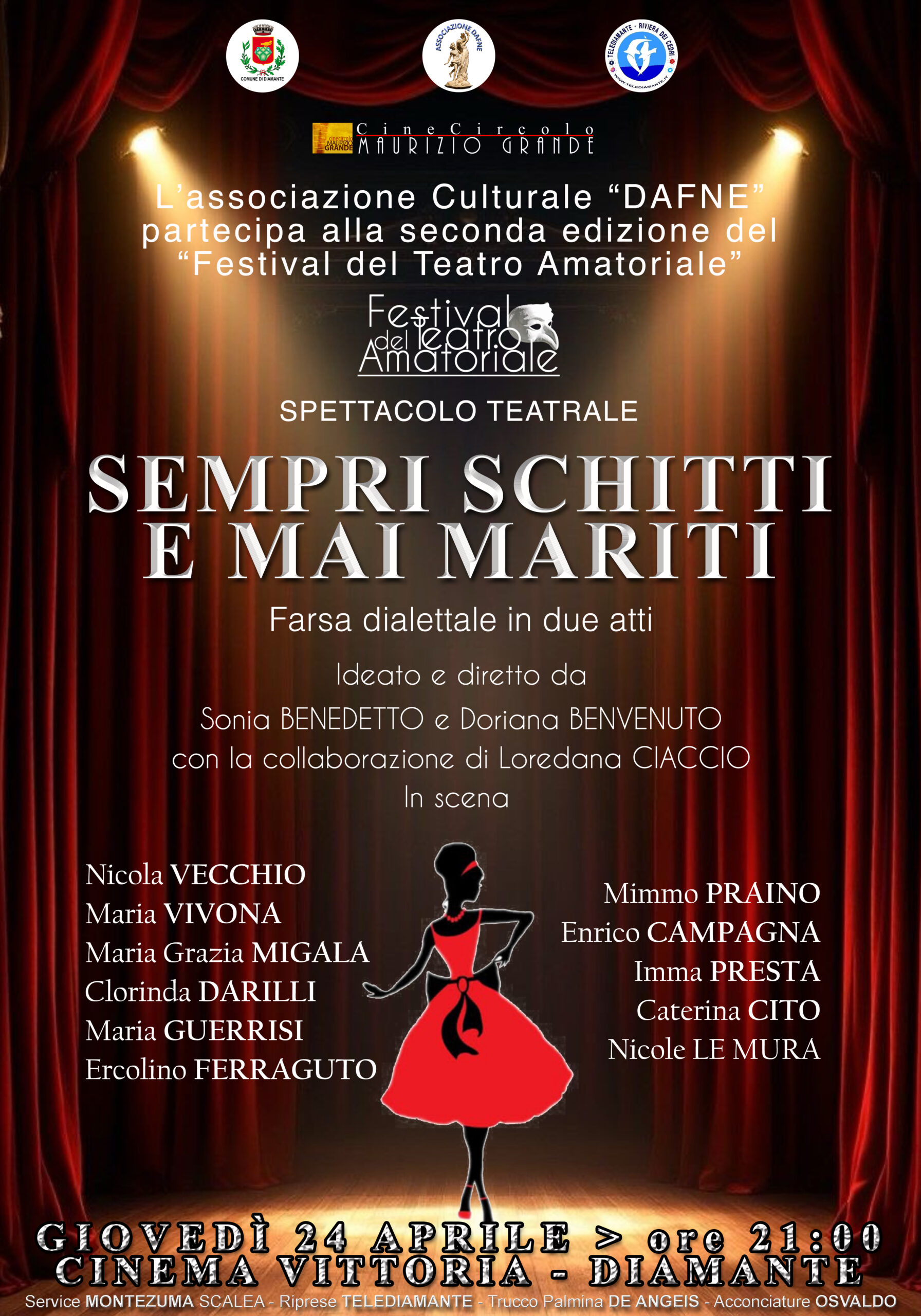 Giovedì 24 aprile alle ore 21:00 all’interno della sala del Cineteatro Vittoria di Diamante, l’Associazione culturale “Dafne” porta in scena “Sempre schitti e mai mariti” farsa dialettale in due atti ideata e diretta da Sonia Benedetto e Doriana Benvenuto con la collaborazione di Loredana Ciaccio. Ospite della serata sarà l’attrice, scrittrice e drammaturga Anna Macrì, attivista per i diritti delle donne e delle minoranze.