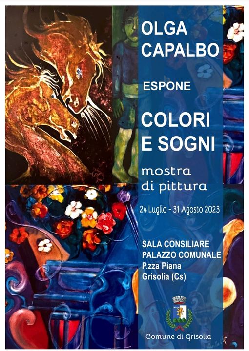 Verrà inaugurata oggi, lunedì 24 luglio, la mostra di Olga Capalbo dal titolo “Colori e sogni”. I quadri resteranno esposti nella sala consiliare del Comune di Grisolia, in piazza Piana, fino al 31 agosto. Una parte di questi, fanno sapere gli organizzatori, sarà donata all’Ente.
