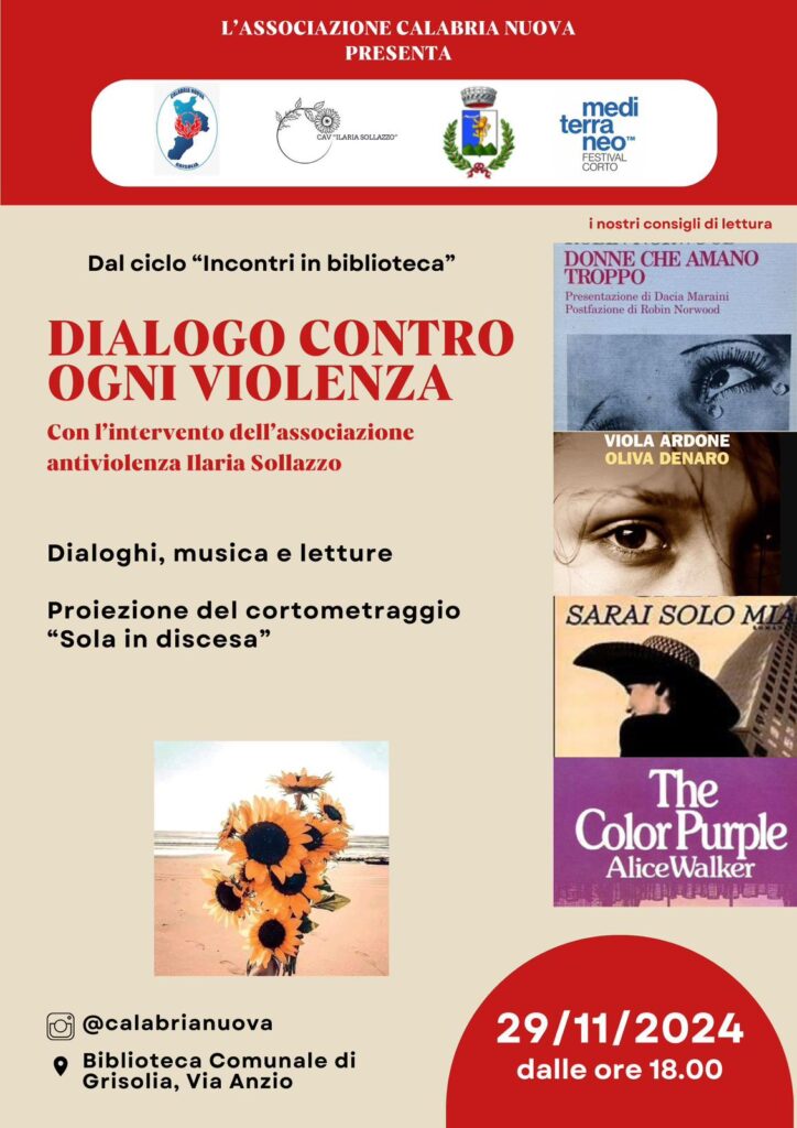 Si terrà venerdì 29 novembre, alle ore 18, presso la Biblioteca comunale di Grisolia, l’incontro “Dialogo contro ogni violenza”. L’evento è frutto della volontà dei ragazzi che animano la biblioteca del comune tirrenico e che hanno voluto puntare i riflettori sulla violenza di genere.