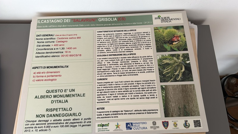 Con i suoi 18 metri di altezza e un’età stimata che supera i 400 anni, il Castagno dei “Salavruni” di Grisolia rappresenta uno degli alberi monumentali più importanti della Calabria, e non solo. Per questo motivo domani, giovedì 06 giugno, alle ore 10.30, in località Monte Grisolia, scuole, associazioni e amministrazione comunale, apporranno una cartellonistica davvero speciale.