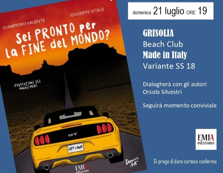 Domenica 21 luglio, a Grisolia (Cs), alle ore 19, presso il beach club “Made in Italy”, Variante ss18, sarà presentato il libro “Sei pronto per la fine del mondo?” di Giampiero Valente e Giuseppe Vitale, edito da EMIA Edizioni.