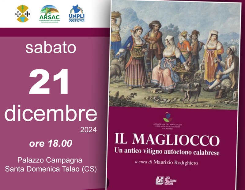 “Il Magliocco: un antico vitigno autoctono calabrese”, libro di Maurizio Rodighiero edito da Luigi Pellegrini Editore, sarà presentato sabato 21 dicembre 2024, alle 18 presso Palazzo Campagna di Santa Domenica Talao.