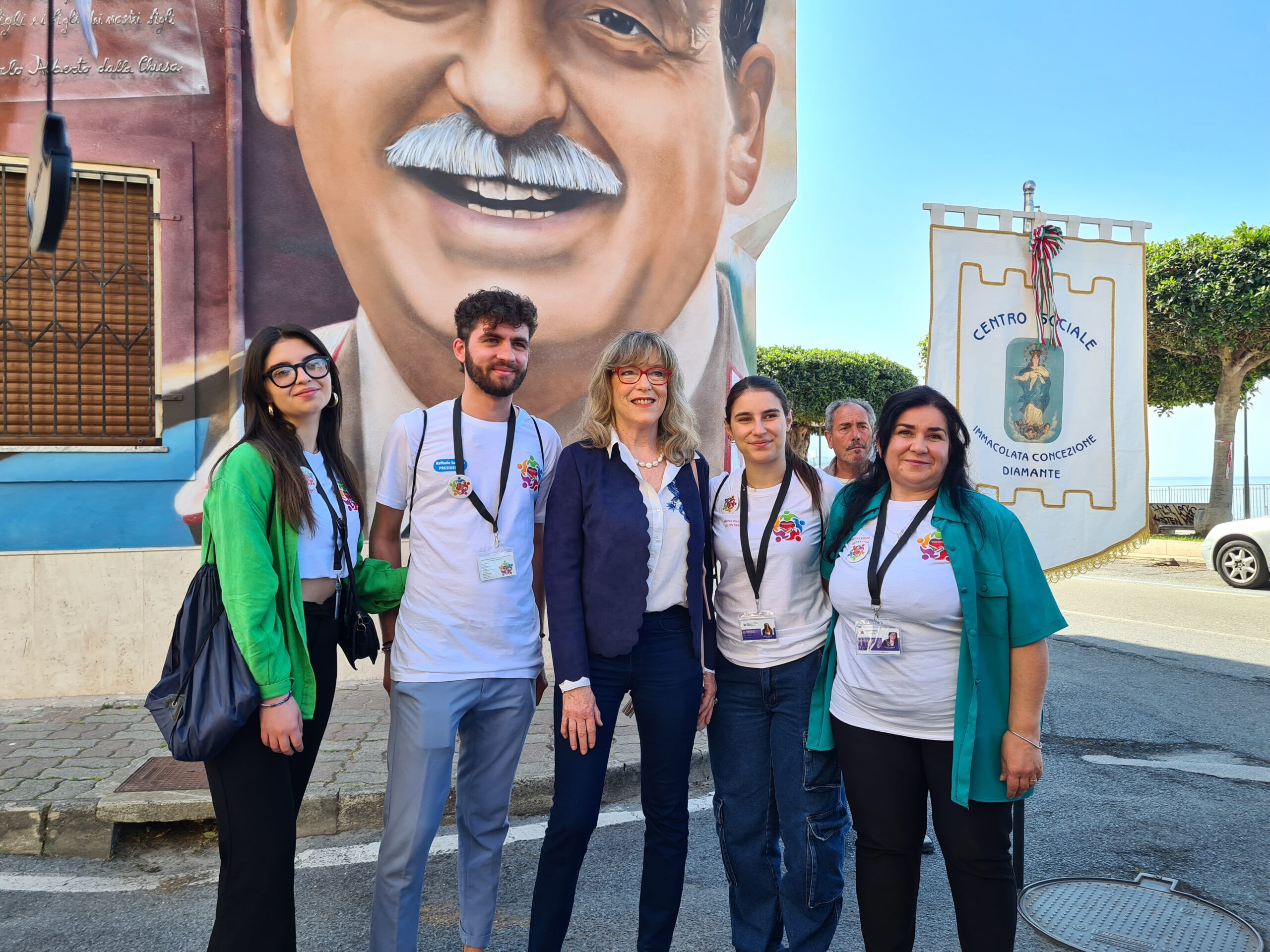 Simona Dalla Chiesa, figlia del Generale Carlo Alberto Dalla Chiesa, giovedì 25 maggio, si è soffermata a lungo a di fronte il murale del padre. “In questa immagine ritrovo mio padre, è lui” dice alle studentesse e agli studenti delle scuole di Diamante che incontra subito dopo. Risponde alle domande che le pongono restituendo un ritratto pubblico ma anche profondamente intimo del padre.