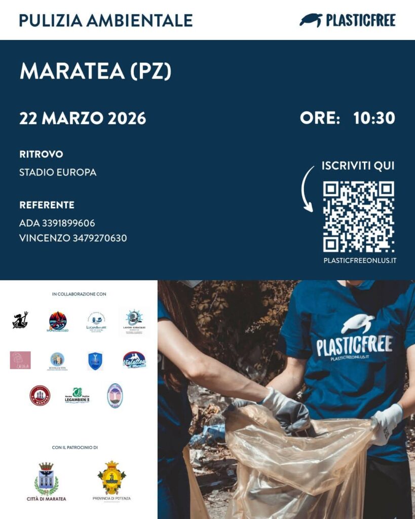 Maratea – Domenica 22 marzo 2026, a partire dalle ore 10:30, il Campo Sportivo Comunale di Maratea (Stadio Europa) ospiterà una mattinata dedicata alla cura del territorio e alla sensibilizzazione ambientale, promossa da Plastic Free insieme alle associazioni locali.
