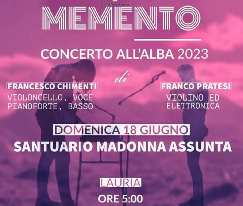 Anche quest’anno si rinnova il grande rito laico in cui la bellezza mozzafiato del paesaggio si fonde con la potenza evocativa della musica: l’appuntamento è fissato per domenica 18 giugno alle ore 5 al Santuario dell’Assunta di Lauria, dove avrà luogo MEMENTO, il concerto all’alba del 2023, organizzato dalla Pro Loco locale, da Arci, Forum dei Giovani, Amici del Castello Ruggero e con il patrocinio della Città di Lauria