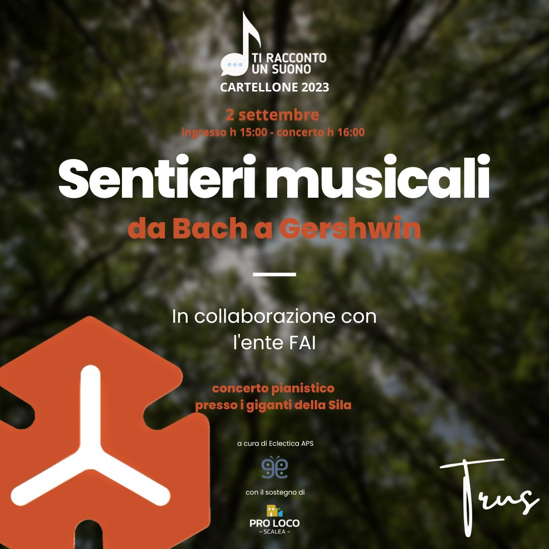 L’evento, patrocinato dalla Proloco di Scalea, condurrà il pubblico attraverso “sentieri musicali” che spaziano dal repertorio di Bach a Gershwin, accompagnati dallo storytelling tipico di Ti Racconto un Suono, che renderà ancor più immersivo l’evento pianistico tra gli alberi monumentali della Sila.