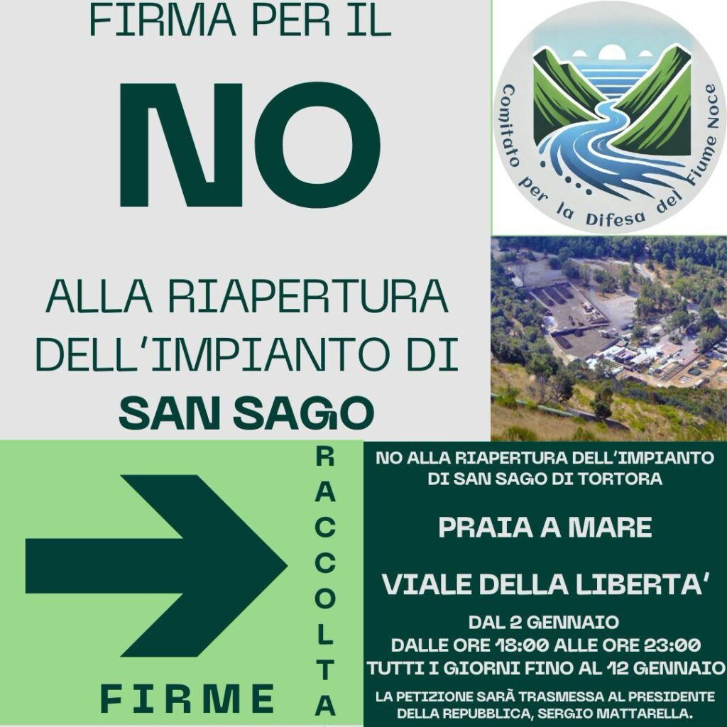 “No alla riapertura dell’impianto di San Sago di Tortora”. Giovedì 02 Gennaio 2025 raccolta firme sul Viale della Libertà di Praia a Mare