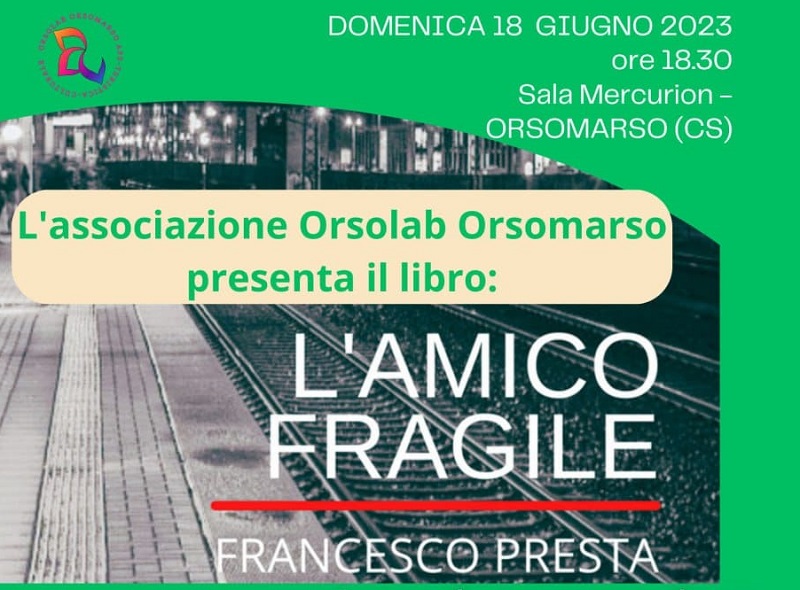 L’amico Fragile, il libro di Francesco Presta dedicato al tema degli abusi subiti dai minori e dalle persone fragili. Continua cosi la tappa culturale e di sensibilizzazione pubblica promossa da mesi dall’associazione Orsolab, finalizzata a trattare temi di rilevanza sociale di impatto che, nelle varie sfaccettature, coinvolgono l’intera comunità attraverso poi eventi e notizie, purtroppo, di cronaca.