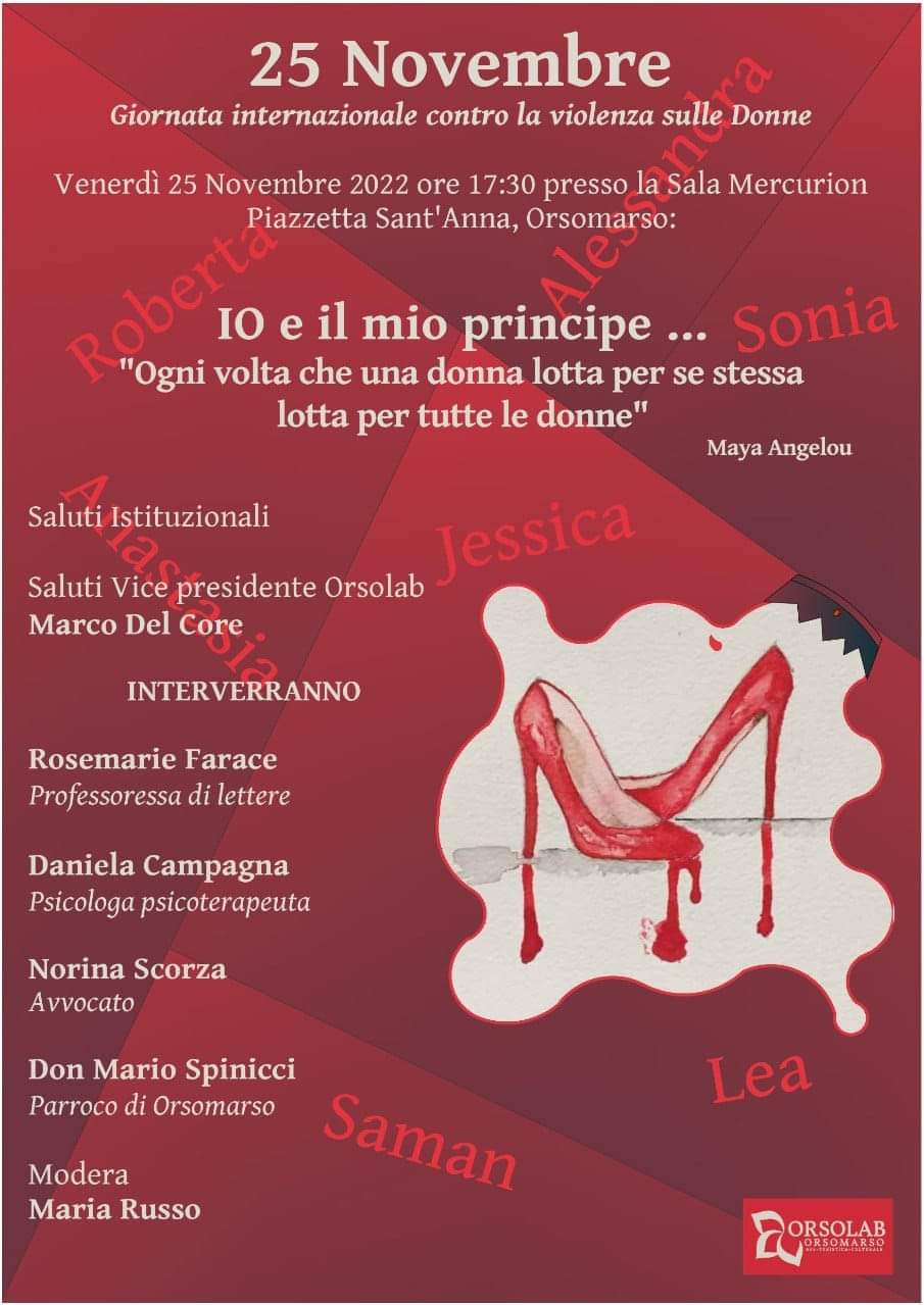Tutto pronto per il convegno dedicato alla giornata mondiale contro la violenza sulle donne, organizzato dall’associazione Orsolab per venerdì 25 novembre, alle ore 17,30, presso la sala “Mercurion” in piazza S. Anna. “Io e il mio Principe” il titolo scelto dal meeting culturale che contribuirà a sensibilizzare l’opinione pubblica locale sul grave problema relativo alle violenze sulle donne, ancora oggi triste realtà quotidiana, molte volte sommersa, che macchia di sangue le pagine di cronaca dei rotocalchi nazionali, senza accennare nessun miglioramento di condizione. L’incontro, ispirato nel titolo alla citazione della poetessa dei diritti civili, Maya Angelou, sarà moderato dalla responsabile del gruppo cultura dell’associazione Orsolab, Maria Russo. Gli interventi previsti al tavolo, oltre ai saluti istituzionali dell’Amministrazione Comunale di Orsomarso e del vice presidente dell’Associazione, Marco Del Core, saranno della dott.ssa Rosemarie Farace, professoressa di lettere, della dott.ssa Daniela Campagna, Psicologa Psicoterapeuta, dall’avv. Norina Scorsa e del parroco Don Mario Spinicci. “Ogni volta che una donna lotta per se stessa , lotta per tutte le donne”.