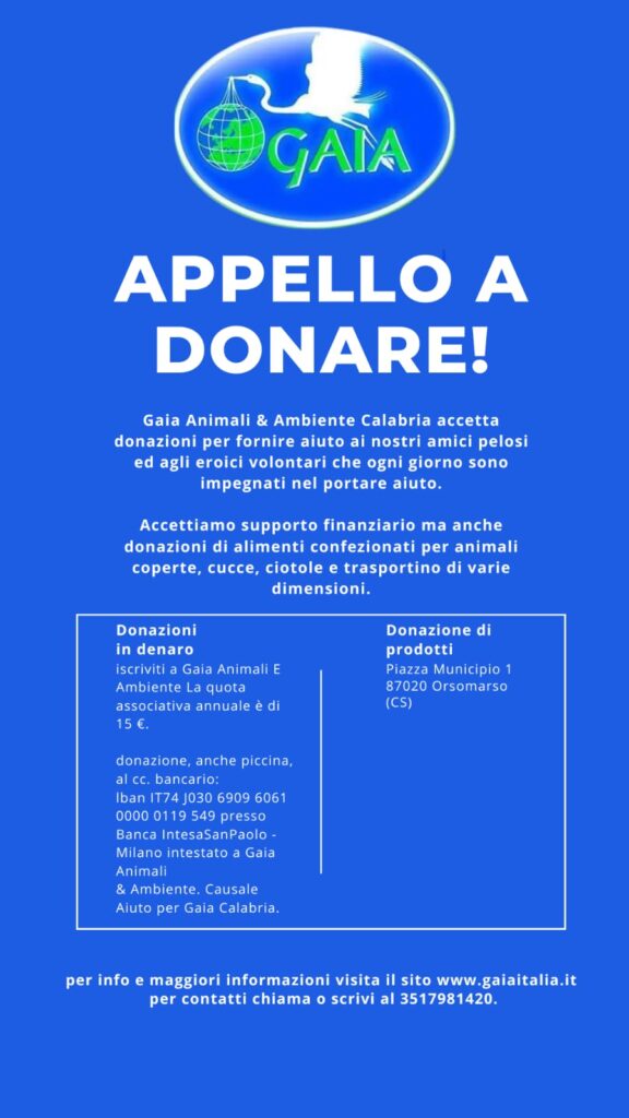 Per la donazione dei prodotti alimentari, l’associazione ha messo a disposizione l’indirizzo di Piazza Municipio, civico 1, presso Orsomarso. Nove i punti del programma dell’associazione animalista per cui viene chiesto sostegno.
