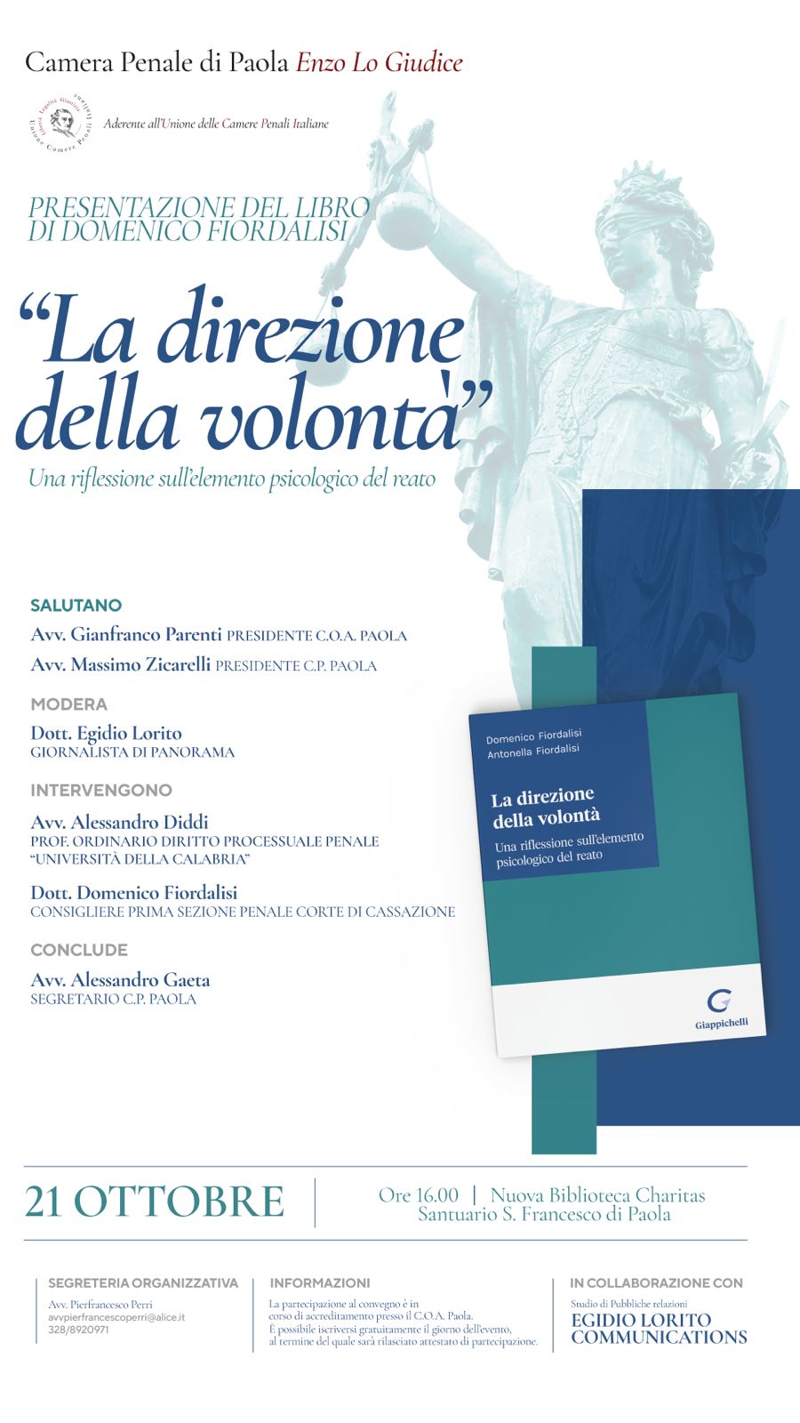 Sarà presentato oggi, sabato 21 ottobre, presso la nuova biblioteca Charitas del Santuario San Francesco di Paola, a partire dalle ore 16, il libro “La direzione della volontà. Una riflessione sull’elemento psicologico del reato”.