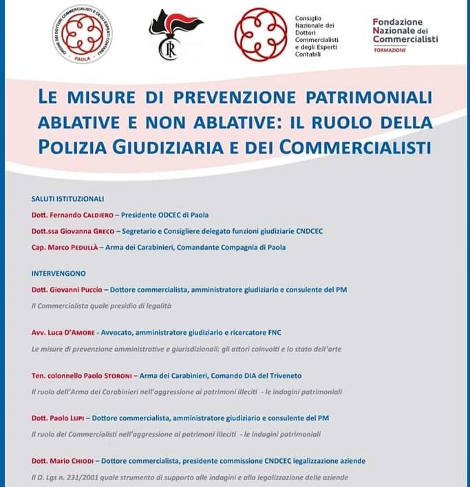 Ad aprire la sessione per i saluti istituzionali saranno il Dott. Fernando Caldiero, Presidente dell’Ordine, la Dott.ssa Giovanna Greco, Segretario e Consigliere delegato funzioni giudiziarie CNDCEC, e il Cap. Marco Pedullà, Comandante della compagnia di Paola dell’arma dei Carabinieri.