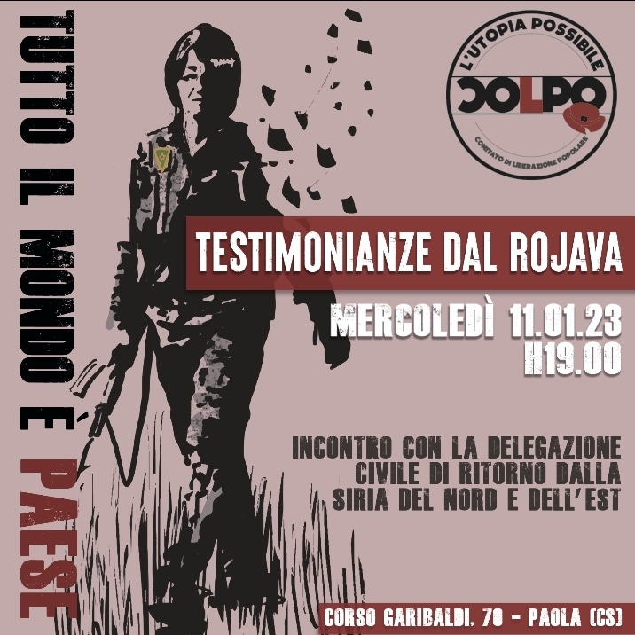 Il Comitato di Liberazione Popolare, attivo da un anno sul territorio paolano, inaugura “Tutto il mondo è PAESE”, uno spazio di discussione sul mondo. Mercoledì 11 gennaio alle 19:00 il primo appuntamento: Testimonianze dal Rojava. Sarà ospite presso la sede dell’associazione CoLPo, sita in corso Garibaldi 70 a Paola, una delegazione civile di Radio Onda d’Urto, emittente bresciana, di ritorno dalla Siria del Nord e dell’Est.L’iniziativa nasce dall’esigenza di parlare di mondo in un paese, essenziale nell’ottica di un’analisi complessiva e reale dei processi che influenzano le vite di tutte e tutti. Cominciare dal Kurdistan è una scelta sentita, perché parte da chi vive isolamento, censura e negazione di diritti.Nel primo incontro verremo a contatto con le esperienze dirette dal Rojava di corrispondenti che hanno seguito i conflitti in Siria del Nord fino allo scorso novembre. La data paolana sarà la prima delle quattro previste in Calabria, a cui seguiranno Cosenza, Catanzaro e Reggio Calabria. La preziosa testimonianza rappresenta l’ultima voce italiana sul campo dall‘aggressione militare turca contro le aree curde divise tra Iraq, Siria, Iran e Turchia.I corrispondenti, partiti per il Rojava come delegazione civile di solidarietà, racconteranno in prima persona ciò che hanno vissuto e quanto sta accadendo nei territori del Nord e dell’Est della Siria.Una discussione aperta a interventi e un momento di coscienza collettiva, finalizzata ad aprire una finestra sulla condizione di donne e uomini che giornalmente praticano comunità e autogoverno nel Rojava, credendo in un’alternativa possibile.
