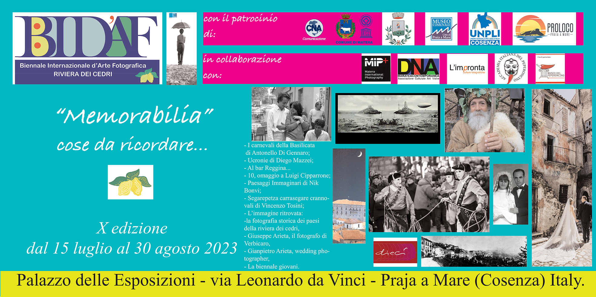 La Biennale internazionale d’arte fotografica della Riviera dei Cedri è stata realizzata con il patrocinio del Comune di Matera e del Comune di Praia a Mare, del Museo Comunale di Praia a Mare, della Pro Loco di Praia a Mare e dell’Unpli Cosenza ed in collaborazione con Matera international photography, DNA Maratea contemporanea, L’impronta – culture fotografiche, l’Accademia italiana del peperoncino ed il Museo del Peperoncino.